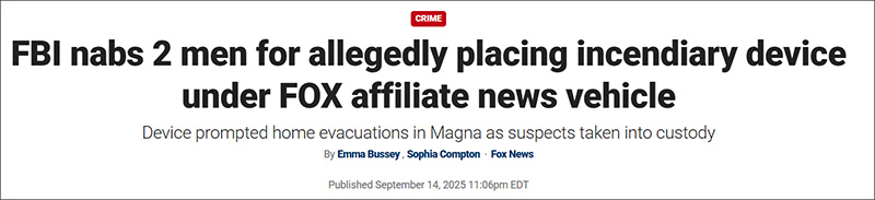 ოფიციალური ცნობების თანახმად, გამოძიებათა ფედერალურმა ბიურომ (FBI) იუტას შტატში დააკავა ორი მამაკაცი იმის შემდეგ, რაც სოლტ ლეიკ სიტიში ტელეარხ FOX 13 News-ის ავტომობილის ქვეშ ბომბი აღმოაჩინა.