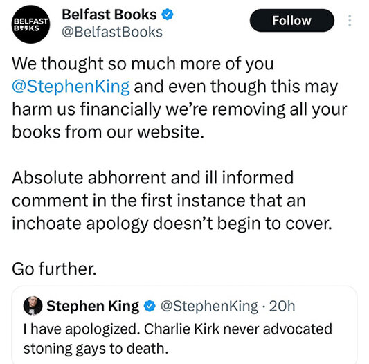 როდესაც სტივენ კინგმა გაიგო, რომ თავისი კომენტარების გამო მისი წიგნების გაყიდვა დაეცემა, თავისი ტვიტი გაიტანა და ბოდიში მოიხადა.