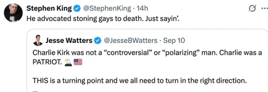 კირკის საპატივცემო პოსტის გამოქვეყნების საპასუხოდ სტივენ კინგი გამოდის განცხადებით, რომ ის "გეების ჩაქოლვის მოწოდებით გამოდიოდა".